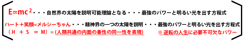 【アリのような弱小の人間でも、プラスエネルギーによってゾウのような大きなマイナスの強敵を倒すことができます。なぜならば、人生は人間の気持ち一つで決まるからです。プラス・マイナスの気持ちはすべて己の心の中で創られるのです。ですから勝者が今のあなたです。敵は「己の心の中に有り」なのです。】