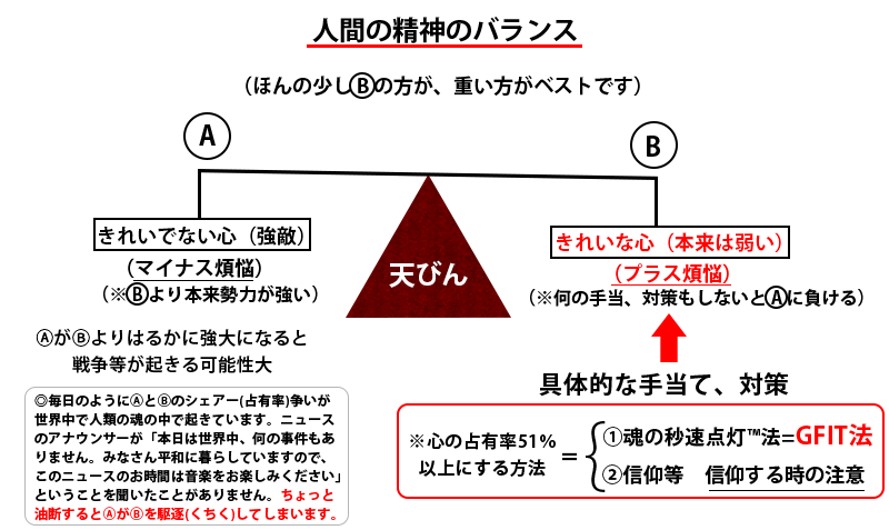 ●正しい信仰を持つ・・・宗教というと何かと変な目で見られるので抵抗を感じている方も多いと思います。しかし、本当の信仰は本来人間としての基本を教えてくれるところです。「正しいこと」を人間が実行することはなかなか難しいのです。悪いことは簡単にできるのです。これが人間です。正しい信仰は「正しいこと」を、勇気をもって実行できる人間を創ります。信念を創ります。まずは、近くにあるキリスト教会の「日曜礼拝」に行き、神様の話を聞きに行くことから始めることもできます。「神仏」とは何か? まずは「ただ聞く」このことから始めましょう。釈迦はこの世は「苦だ」と悟りました。感受性が強く、繊細な釈迦はその「苦」によって三大宗教の一つの仏教の開祖となりました。もし、人間に「苦と罪」がなければ仏教はないということになります。また、聖書もないということになります。十字架もなく、赤十字社、赤十字病院等もないということになります。よく建設現場にある「安全マークの旗」もないということです。