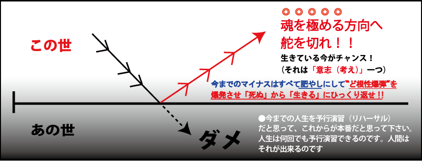 ② 「本当の自分」を発見したら次に何をしたらいいのか・・・この状況になったのは、自分が原因だったことがおそらく分かると思います。そう思ったらいままでの人生は予行演習だったと考えてみてください。いままでは仕方がないと考えてください。人間一年生に戻り勉強し、本番はこれからだと思ってください。これから本当の人生の幕が開き、本番が始まると考えてください。人間はそのように考えて人生をやり直すことができるのです。やり直しは何回もできます。もし、人間にやり直しができないとなれば、人類はとっくに滅亡しています。人類の文明は、先人がどん底(地獄)の逆境を逆にバネにして這い上がって築いてきたものなのです。ですからどん底(地獄)とは人間が成長する一丁目一番地ということです。逆に今あなたは大きく飛躍できるチャンスが訪れています。