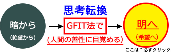 ※逆境を味方につけ、それを逆に肥やしにして成長しよう!! 逆境に直面した時こそ、成長のチャンスが来ているのです。生きる道は千手観音の「千手」のごとく千(=多く)の手(=方法、道)があることに気付きましょう。 上記の項目からたどり着く境地は「苦(く)の境地」です。その「苦(く)」の境地から「楽(らく)」の境地への転換、それがGFIT法です(ここのところの「AからBに変わること」)。「苦(く)」を粉砕する方法がGFIT法です。「苦(く)」は気にしてしまう(固執する)と頭の中からなかなか消えません。魂が晴れ晴れしない一つの理由はそのためなのです。これは精神衛生上よくありません。悪い方向に行く出発点です。 (まずは人生、気持ちから!!) 魂のイノベーションの核心部分 (脳内のミラー細胞にメルシーちゃんを焼き付ける)