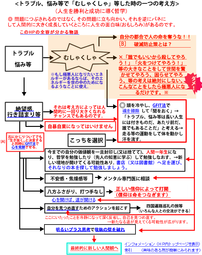 ※[A]のところではあなたの内なるもう一人の自分が時には負の誘惑をささやきます。たとえば「このまま生きていたっていいことはない。いっそのこと死んだ方が楽だ」とか「人に迷惑をかけたくない」とか「俺(私)は何の価値もない人間だ」「今、私が死ねばすべてがうまくいき、丸くおさまり損しなくて利益が出る」等々です。これらは自殺を考えて実行する場合、その自殺を正当化するため、自分自身を納得させる一つの言い訳です。人間が自ら死を選ぶときにはそれ相当の理由が必要なのです。しかし、もう一人の内なる強いあなたは、その負の誘惑に「生きぬく決意」という武器で勝利しなければなりません。ここに勝利するための闘いがあります。人間はそれ相当の言い訳によって自分を美化してごまかす傾向があるのです。このようなものに決して負けてはなりません。 [B]のところでもし、もう一人の自分が「人を殺せ!人を殺せ!」とか「火をつけろ!火をつけろ!」等とあなたにささやいたならば、もう一人の内なる強い善玉魂のあなたは「ふざけるな、このバカヤロウ!!そんな悪い事できるか!!くたばれ悪党め!!」と何回も心の中で叫んで(叫ぶとミラー細胞がそのことをインプットしてくれます)この闘いに勝利して下さい。この闘いが運命の分かれ道なのです。あなたの最大の敵はあたな自身の中にある悪玉魂なのです。 (補足・・・①倒産した中小企業の経営者がよく「人に迷惑をかけたくない」と言って、自ら命を絶って生命保険金を借金に充てるということが時々起こります。心情的には分かります。しかし倒産の正しい解決は法律を使って整理することです。命と引き換えに整理する必要はありません。この世の中、聖人君子はいないのです。みんな大なり小なり失敗したり、挫折したりして生きているのです。そして人からそれらのことを許してもらって生きているのです。ですから命を絶つのではなく、生きぬいて、何らかの方法でその許されたその恩を、社会にお返しする方法を考えればよいのです。(応々にして人間の脳は失敗や挫折した後に新しいアイデアというものがひらめくのです。そして脳は失敗や挫折した経験が肥よくな土壌となって新しいアイデアという芽を大きく成長させてくれるものなのです。ですから早まって死んだのでは、そんなチャンスにめぐり合うことができないのです)。 ②人間は失敗してからが本当の真価が問われるのです。あのミッキーマウスで有名なウォルトディズニーでさえ破産したのですよ。そして破産してから成功しているのです。世の中には裸一貫で成功している人は大勢います。問題は「失敗から何を学ぶか」なのです。※ 2017年1月に就任したアメリカ大統領のトランプ氏は事業展開中に過去4回破産しています。それにもめげず最後に成功しました。 ③今、失業して路頭に迷っている人が多いというニュースを聞きます。こんなニュースを聞くたびに「失業している人は仕事を選んでいませんか」と問いたくなるときがあります。こんな時代は「何でもしてやる!!」というたくましさが必要だと思うのです。何か一つの目的を持って働けば、心の奥に眠っている「たくましさ」がきっと表に出てくると思うのです。こんな厳しい時代ではありますが考え方によっては「たくましさ」という、目には見えない利益を身に付ける絶好のチャンス、と捉えることもできます。)
